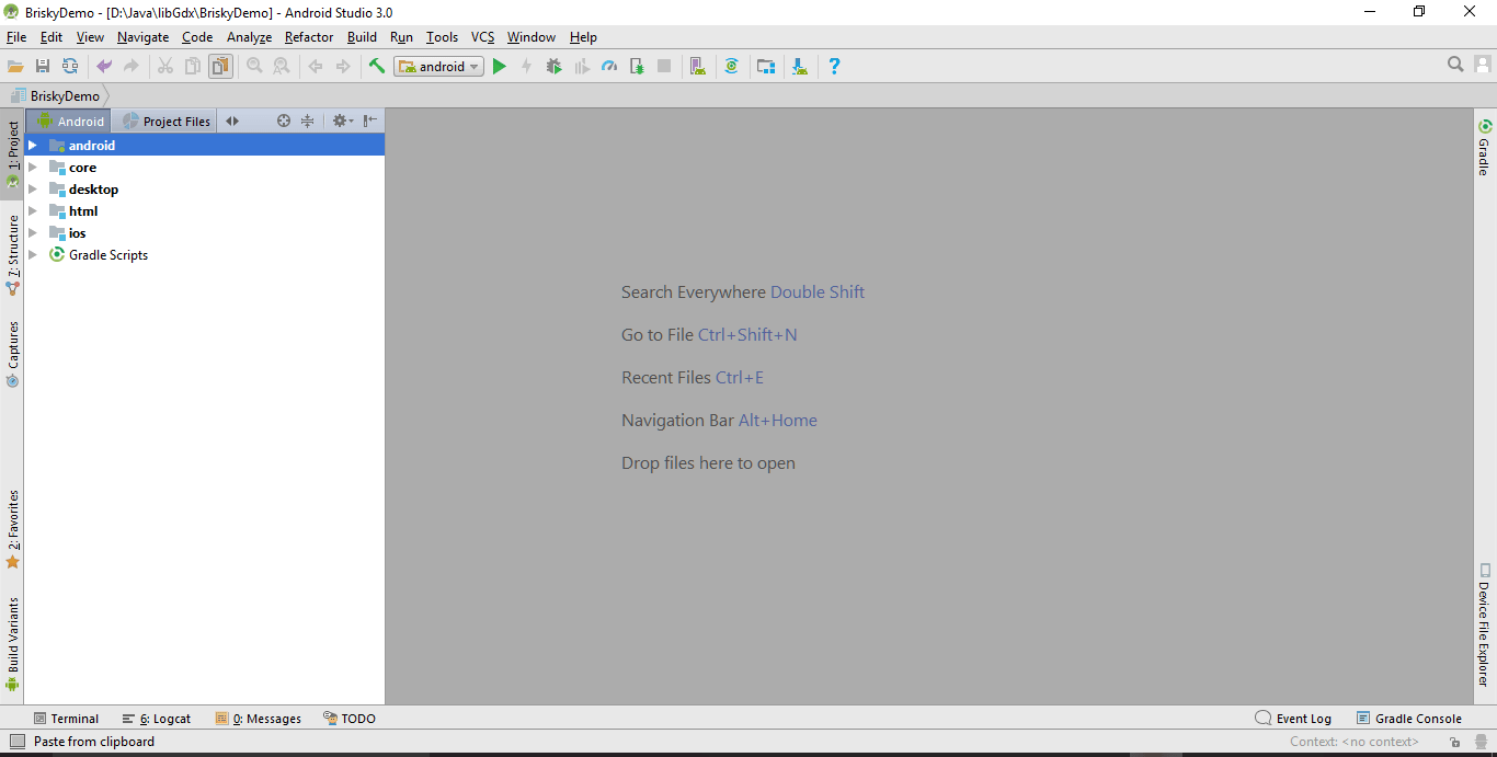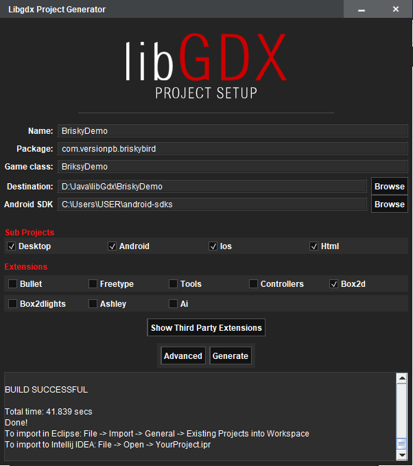 Destination : D:\Java\libGdx\BriskyDemo ( Make Sure you have this directory in your machine , if not give path accordingly )