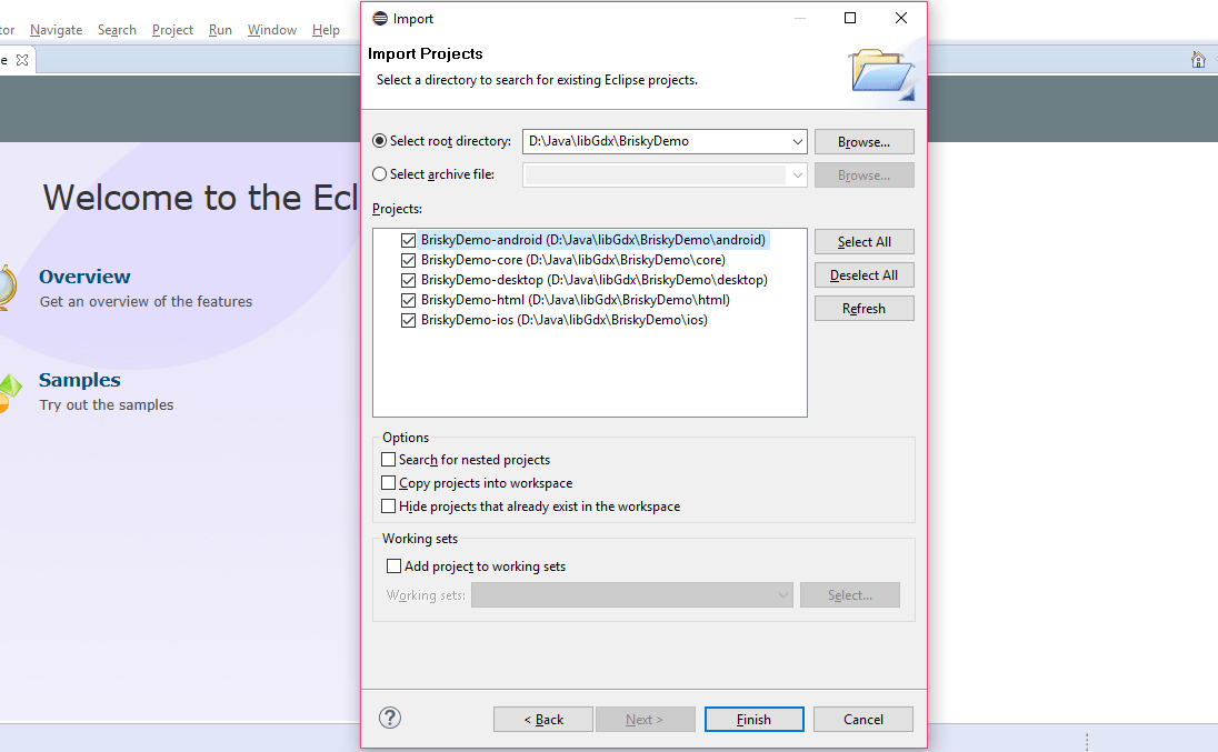 Browse to the Destination which you have given while creating libGDX build , i.e. D:\Java\libGdx\BriskyDemo for my Case . You will see Eclipse will show 5 projects to be imported . Just Click Finish