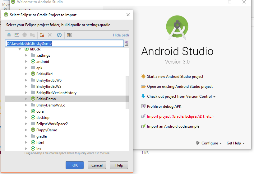 Give the path of the destination which we have given while building libGDX setup app and click OK . It might ask for which SDK to Use , Select android Studio SDK . It will take some time to load and finally will load all 5 projects as loaded in Eclipse